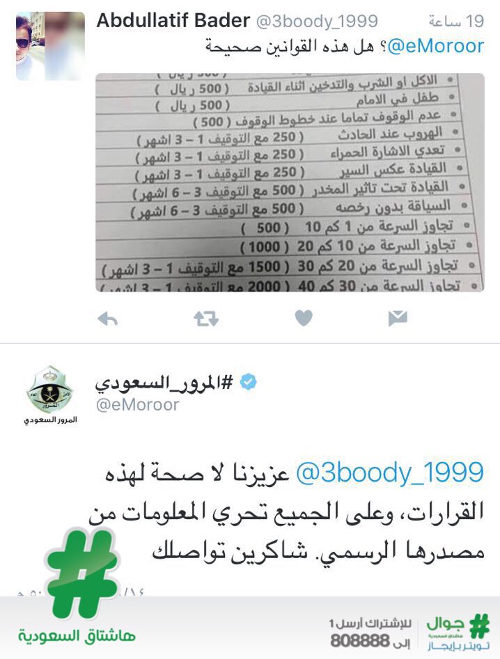 هاشتاق السعودية On Twitter المرور ينفي ما يتداول حول تحديد المخالفات المرورية الجديدة أو تقصيطها أو تخفيضها ويدعو لتحري المعلومات الصحيحة