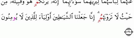 ي ا ب ن ي آد م ل ا ي ف ت ن ن ك م الش ي ط ان ك م ا أ خ ر ج أ ب و ي ك م م ن ال ج ن ة ي ن ز ع ع ن ه م ا ل ب اس ه م ا ل ي ر ي ه م ا س و آت ه م ا إ ن ه ي ر اك م ه و و ق ب يل ه م ن ح ي ث ل ا ت ر و ن ه م إ ن ا ج ع ل ن ا الش ي اط ين