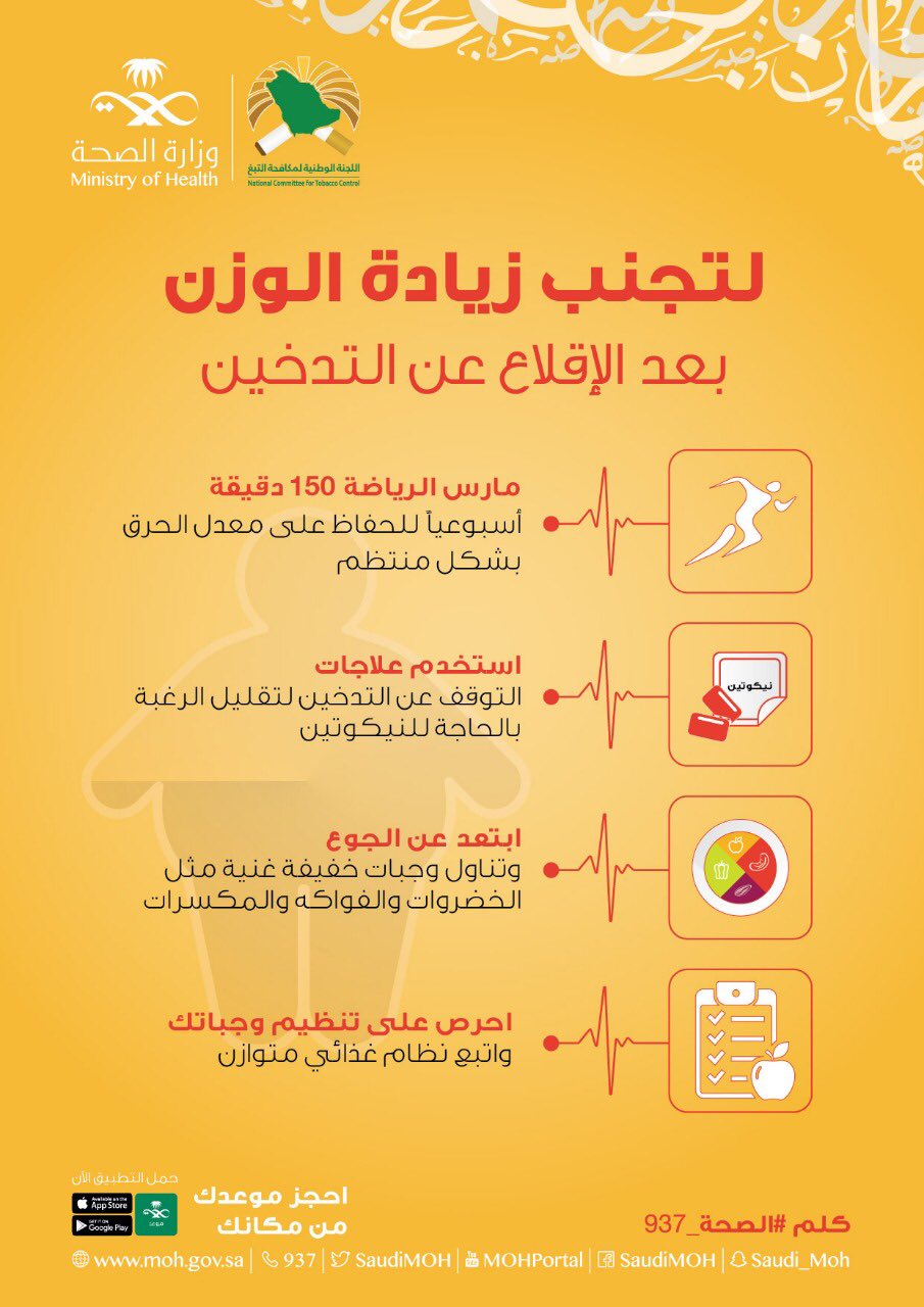 و ز ا ر ة ا لـ صـ حـ ة السعودية On Twitter ت شير الدراسات بعد سنة من الإقلاع عن التدخين يزيد الوزن من 5 4 كجم وذلك بسبب التوقف عن النيكوتين المسبب
